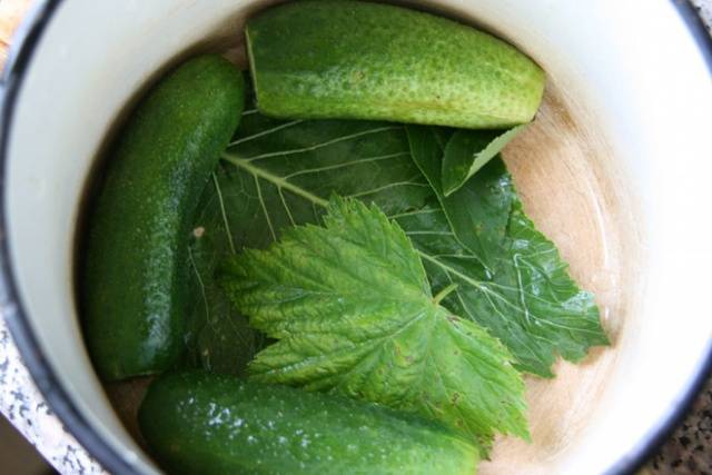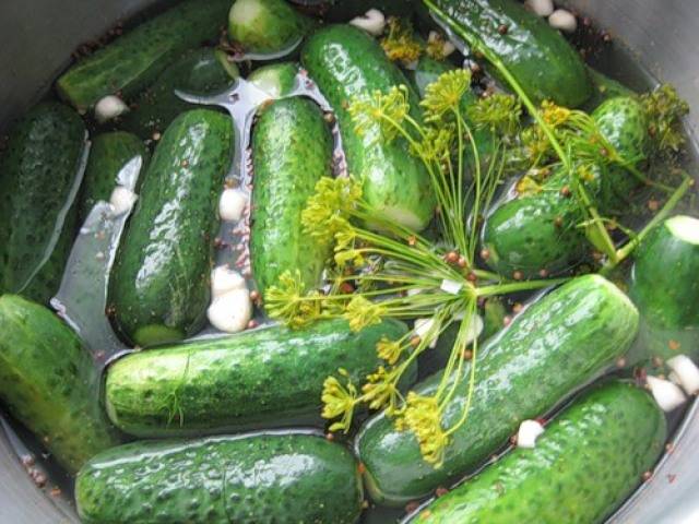 Como sempre, cortamos as pontas das frutas lavadas e as deixamos de molho em água fria por várias horas. Depois disso, coloque ervas com especiarias e pepinos em camadas em uma panela. Preencha todas as camadas com salmoura quente de água e sal e deixe esfriar em temperatura normal. Coloque a panela resfriada na geladeira. No dia seguinte, você pode comer pepinos.
