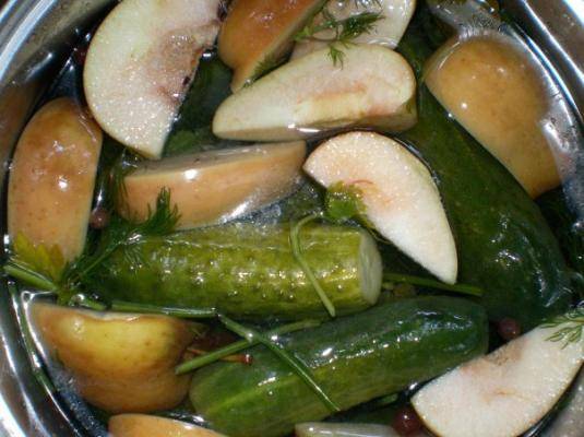 Com os pepinos, é necessário fazer as mesmas manipulações da receita anterior, a saber: enxaguar, aparar as pontas e molhar. No fundo do recipiente selecionado, coloque metade das verduras lavadas. Os frutos são espalhados sobre ele. A última camada é disposta com os restos de folhagens e maçãs cortadas em rodelas. Tudo isso é derramado com salmoura de água fervente e sal e fechado com uma tampa. Após o resfriamento, o recipiente é levado à geladeira por um dia.