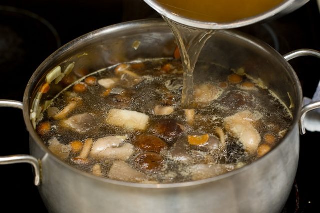 - A água é colocada em uma panela e levada para ferver, os cogumelos são colocados e fervidos por mais 15 minutos.