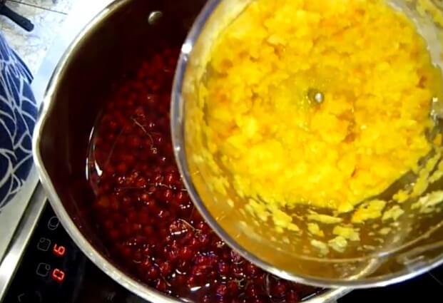 Os frutos são consumidos em porções iguais. 1,8 kg de açúcar são adicionados à massa total de 2 kg de fruta. Os bagos são triturados em uma peneira separadamente e, em seguida, o purê resultante é combinado. Adormecer com o açúcar, ferva em fogo baixo até ferver. Em seguida, retire a espuma, retire para esfriar. O processo de cozimento é repetido.