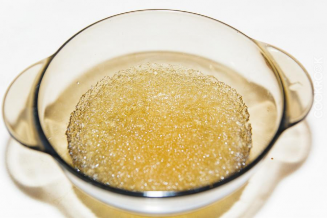 - Água quente fervida deve ser despejada em um recipiente com ágar-ágar, mexa bem e deixe por 5-10 minutos para inchar.