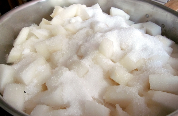 - Você pode colocar o melão em uma panela, polvilhar com ácido cítrico por cima ou despejar suco de limão. Adicione o açúcar e mexa para que todos os pedaços fiquem uniformemente cobertos com areia.