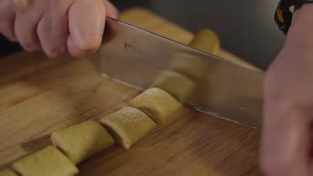 As metades descascadas são cortadas em fatias de 5 a 8 cm de largura.