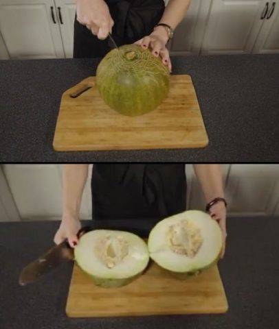 Para o marshmallow, escolha um melão de tamanho médio. É bem lavado e seco com papel toalha. Em seguida, coloque em uma tábua e corte ao meio.