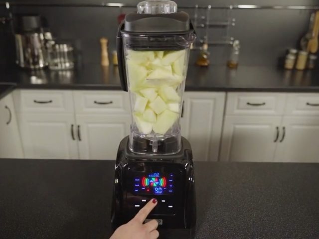Cortado em pedaços pequenos, o melão é transferido para um liquidificador. Moa até ficar homogêneo.