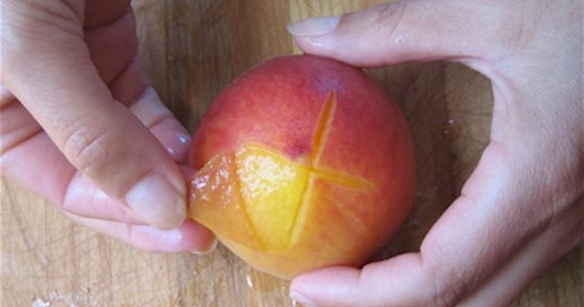 - Escalde os pedaços de pêssego preparados até ficarem macios.