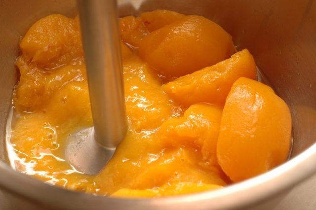 - Os pêssegos cozidos são amassados com um esmagamento (se desejado, para obter uma geléia com fragmentos densos) ou picados até ficarem homogêneos no liquidificador.