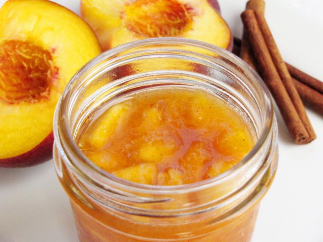 É permitido manter a peça em chamas até que a consistência desejada seja obtida. A geléia de pêssego pronta é colocada em potes esterilizados enquanto ainda está quente. O sabor a canela do branco é perfeito para rechear assados de qualquer tipo de massa.