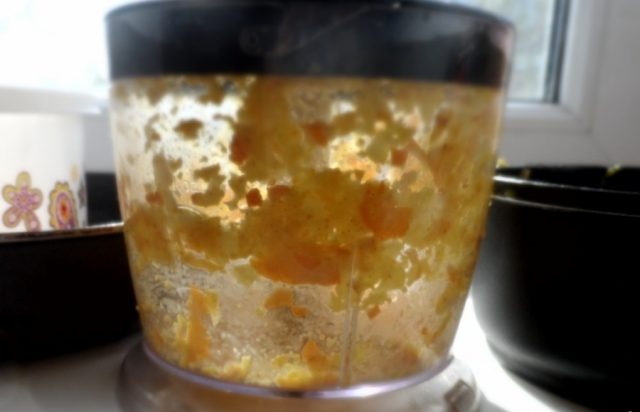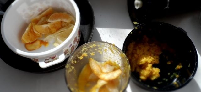 - Em uma tigela funda e conveniente (ou no liquidificador), misture as raspas raladas, a casca e a polpa da laranja e do limão sem caroço.