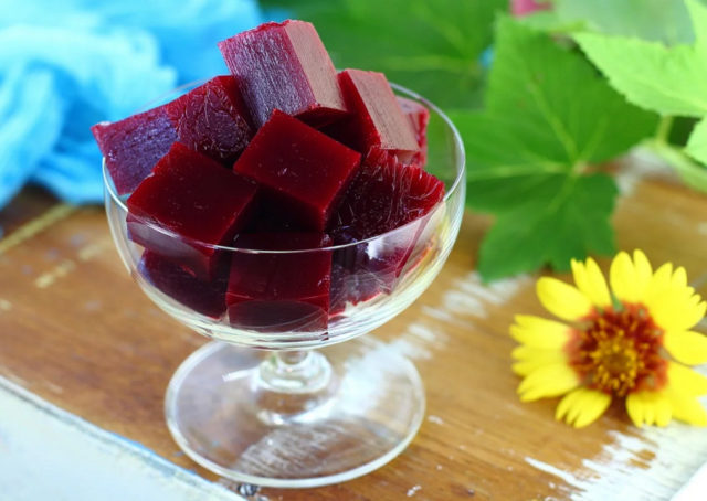 Quando a mistura ferver, ágar-ágar pré-preparado é adicionado a ela. A calda é então cozida até engrossar. Depois disso, é despejado em formas e deixado esfriar.