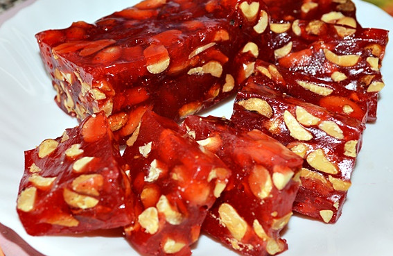 - Depois que a marmelada "pega" um pouco, as nozes são colocadas sobre ela e o resto é derramado por cima.