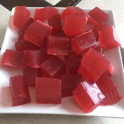 - Adiciona-se sumo de cereja com gelatina. Quando tudo esfria um pouco, é colocado em formas e colocado na geladeira por 2 horas.
