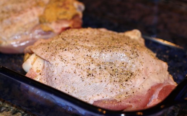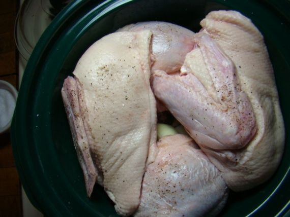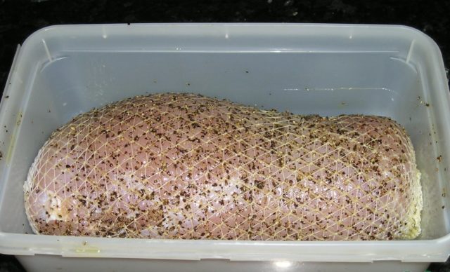- Esfregue com sal e mantenha na geladeira por dois dias. Prepare uma mistura salgada de: 80 g de sal, 15-20 g de açúcar, 1,5 g de ácido ascórbico. A carcaça ou suas partes individuais devem ser esfregadas com essa mistura novamente, colocadas em um recipiente adequado, com a pele voltada para baixo, onde o sal é despejado no fundo. Se desejar, você pode usar folhas de louro e pimenta-do-reino.