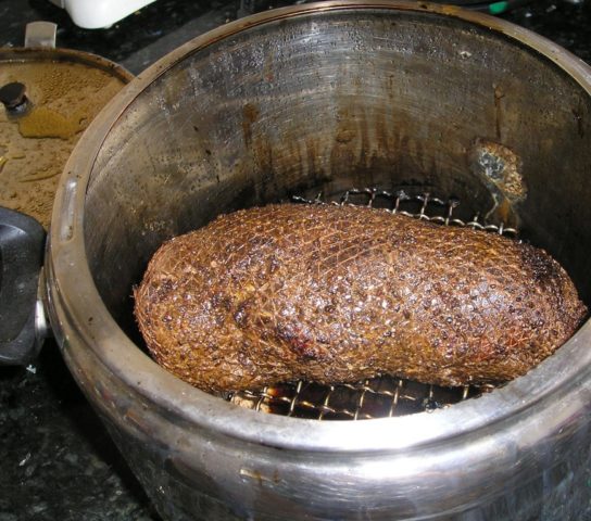 - Coloque o recipiente com o preparo e opressão na geladeira durante a noite, no dia seguinte, pique a carne com este líquido, e coloque novamente em local fresco por 4 dias. Retire, enxágue e pendure para permitir que o excesso de líquido chegue ao vidro. Fume em uma cabine para fumantes por 1,5-2 horas.