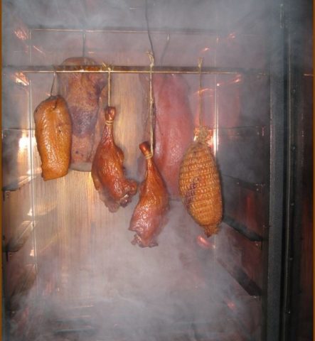 As carcaças podem ser colocadas na grade ou penduradas em ganchos. Durante o processo de defumação, não há necessidade de virar o produto periodicamente, a fumaça gerada durante o aquecimento é distribuída uniformemente na câmara de defumação. Quando o tempo de cozimento é de 6 a 7 horas, algumas vezes ainda é necessário abrir a porta para remover a umidade acumulada.