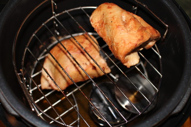- Salgue e apimente a carne, rale com os temperos e deixe repousar durante a noite na geladeira. Coloque uma gradinha no fundo da tigela, limpe a carne de peru com uma toalha de papel e coloque. Cubra com uma tampa, coloque um bico cheio de batatas fritas.