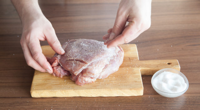 - Lave e seque as pernas, faça vários furos para melhor penetração da marinada de alho “Maheev” (170 g por 1,7 kg de matéria-prima). É o suficiente para manter a carne nele por duas horas.
