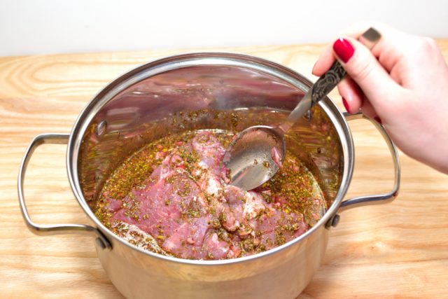 - Esfregue com sal, pimenta e suco de limão. Faça uma salmoura com 1 litro de água, 2 colheres de sopa. eu. sal, 1 colher de sopa. eu. salsa picada, 3 colheres de sopa. eu. vinho tinto e adicione 1 cebola. O tempo de marinada da carne é uma noite.