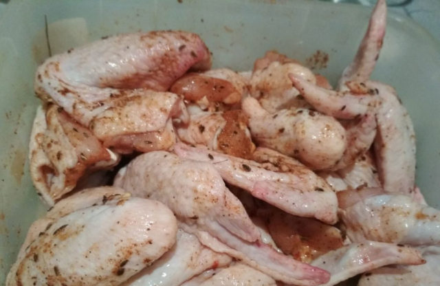 - Esfregue as asas com uma mistura de temperos (sal e pimenta), coloque bem em uma tigela, deixe por 3 horas.
