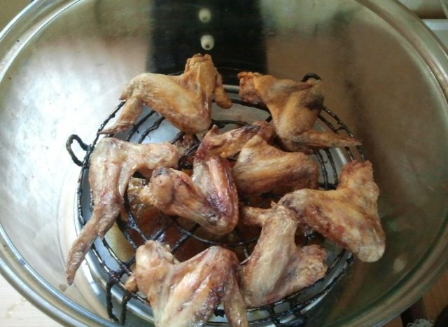 - Retire as asas de frango com uma escumadeira. Deixe-os esfriar. Mantenha por 1 hora em uma câmara de secagem. Corda em espetos de madeira. Envie para o compartimento de defumação quente com batatas fritas e cozinhe a 90 graus.