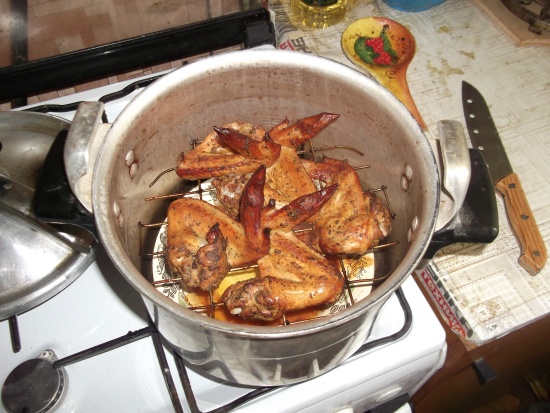 - Em seguida, instale uma grelha no caldeirão (por exemplo, você pode tirar de um banho-maria) e coloque as asas sobre ela para que não entrem em contato uma com a outra e com as paredes da louça.