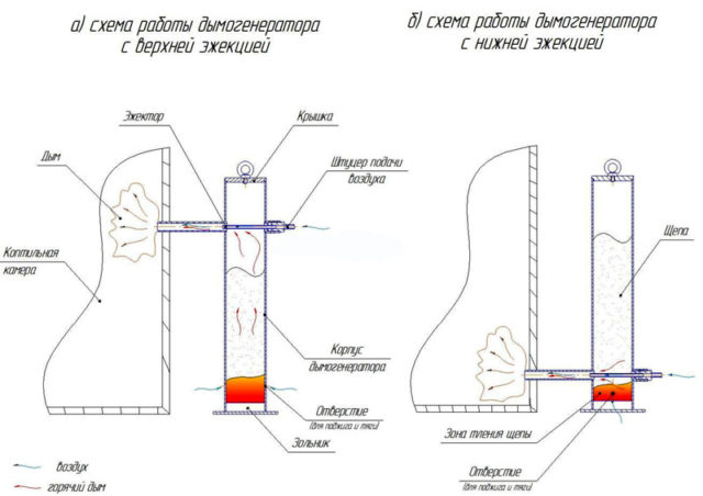 Para fumar a frio, costuma-se usar um dispositivo compacto fechado - um gerador de fumaça. Isso facilita muito o processo de cozimento, pois não requer intervenção humana constante. A essência de seu trabalho é a decomposição térmica da madeira com falta de oxigênio. A serragem é colocada no gerador de fumaça. O processo de sua combustão lenta é fornecido por um aquecedor a gás ou elétrico. O ejetor é responsável pela circulação da fumaça do gerador para o tanque do produto. É um tubo e pode ser localizado na parte superior ou inferior do dispositivo. A fumaça é soprada na câmara de fumaça por meio de um compressor.