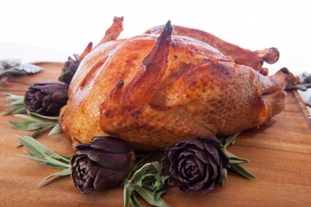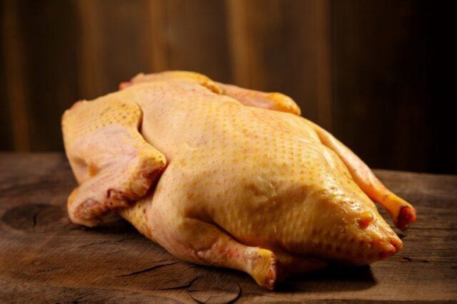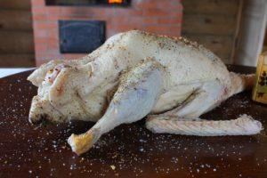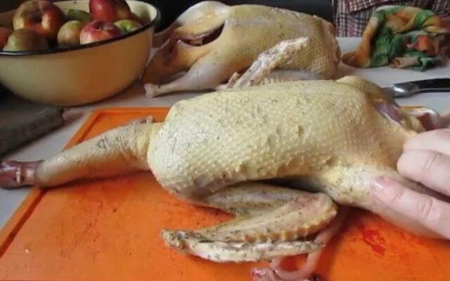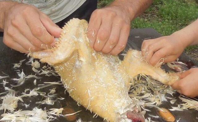 - Corte o tecido adiposo em excesso, a cabeça, a cauda e as pontas das asas. Após a separação da cabeça, o bócio é removido. Se desejado, a carcaça é dividida ao meio ao longo da espinha.