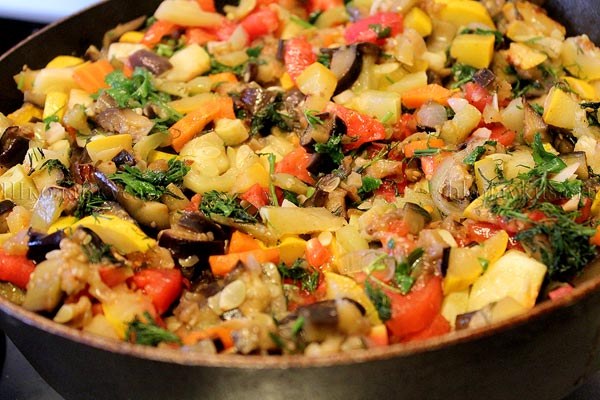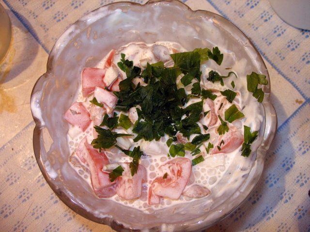 Não vale a pena cozinhar uma salada de acordo com a receita proposta em grandes volumes. Os tomates rapidamente se transformam em suco e perdem o sabor.