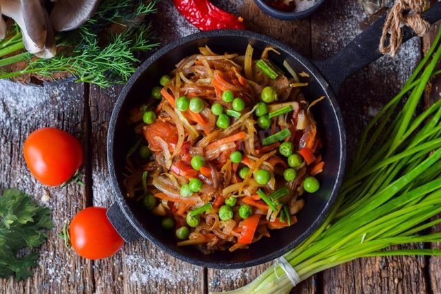 - Pique o alho em pedaços menores. Envie para vegetais. Adicione as ervilhas. Mexa e cozinhe por 2 minutos. Polvilhe com cebola verde picada.
