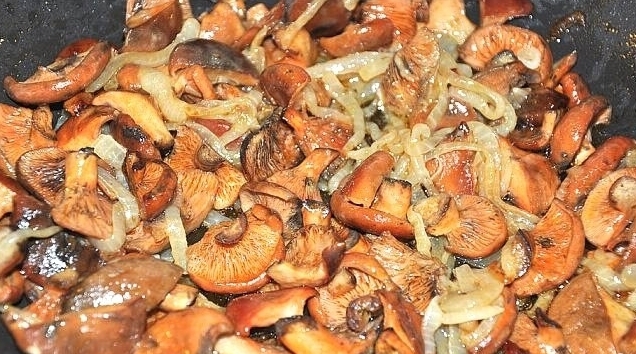 - Descasque a cebola, pique-a em pequenos pedaços, acrescente aos cogumelos fritos.