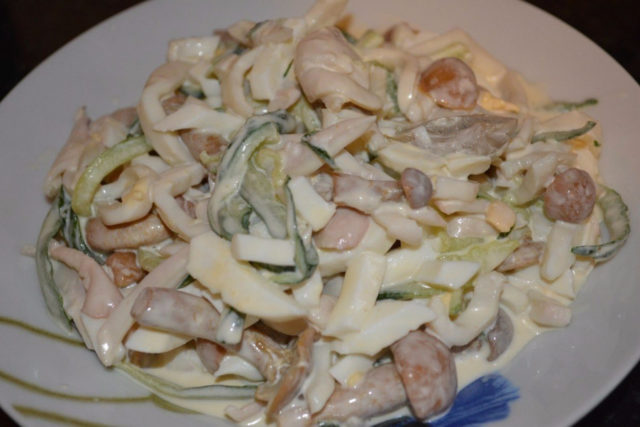 - Tanto os cogumelos quanto as lulas são resfriados, depois cortados em fatias de tamanho conveniente, geralmente canudos, e misturados em uma tigela funda.