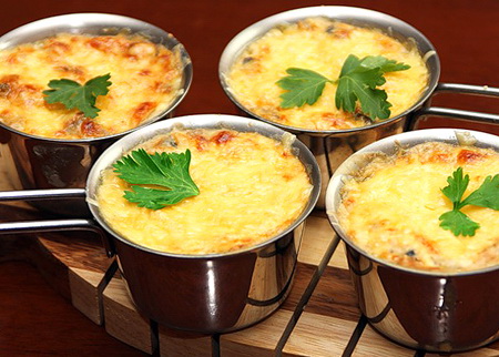 - Os cogumelos são servidos com uma mistura de creme de leite e alho, em seguida, círculos de tomate são dispostos em cima, polvilhados com queijo ralado e ervas picadas.